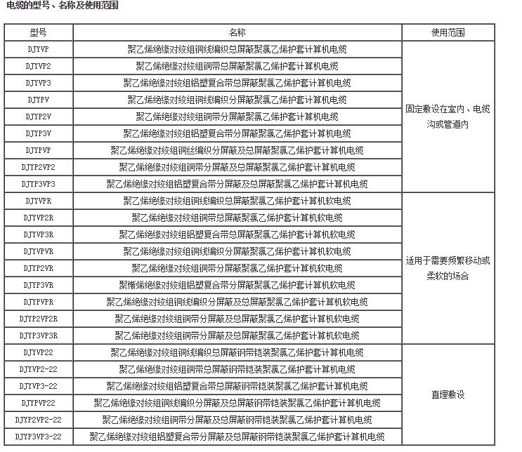 屏蔽材料有圓銅線、銅帶、鋁箔/塑料復(fù)合帶三種。屏蔽對(duì)與屏蔽對(duì)具有較好的絕緣性能,電纜在使用中若屏蔽對(duì)與屏蔽對(duì)之間出現(xiàn)電位差時(shí),不會(huì)影響信號(hào)的傳輸質(zhì)量。 計(jì)算機(jī)電纜的型號(hào)、名稱及使用范圍見表。